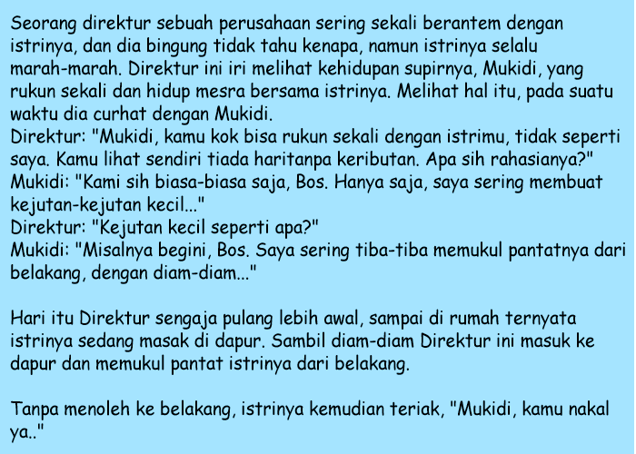 Masih suka cerita lucu dari Mukidi? nah berikut ini adalah salah satu cerita lucunya yang mengisahkan tentang Mukidi yang mencontohkan kepada bos-nya rahasia kehidupan rumah tangganya yang harmonis.